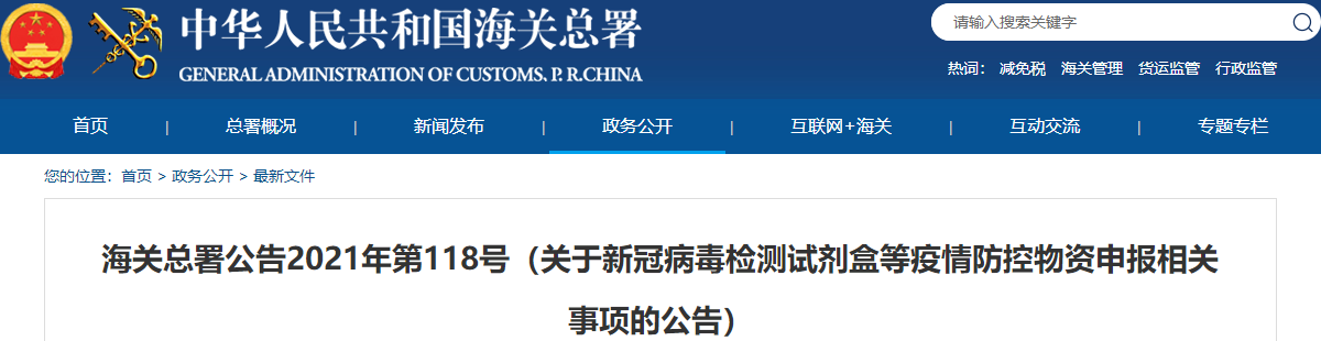 海關(guān)總署公告2021年第118號(hào)(關(guān)于新冠病毒檢測試劑盒等疫情防控物資申報(bào)相關(guān)事項(xiàng)的公告)