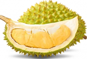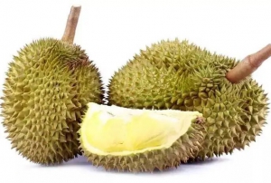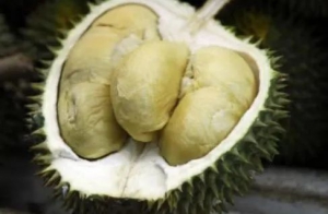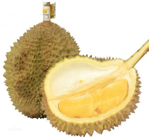 貓山王榴蓮原產(chǎn)馬來西亞,單果重量較小,果皮多為綠色,果肉呈現(xiàn)姜黃色,有凝脂感,榴蓮氣味濃郁,主要特征為無尾尖,果實飽滿,尾部呈星型。
