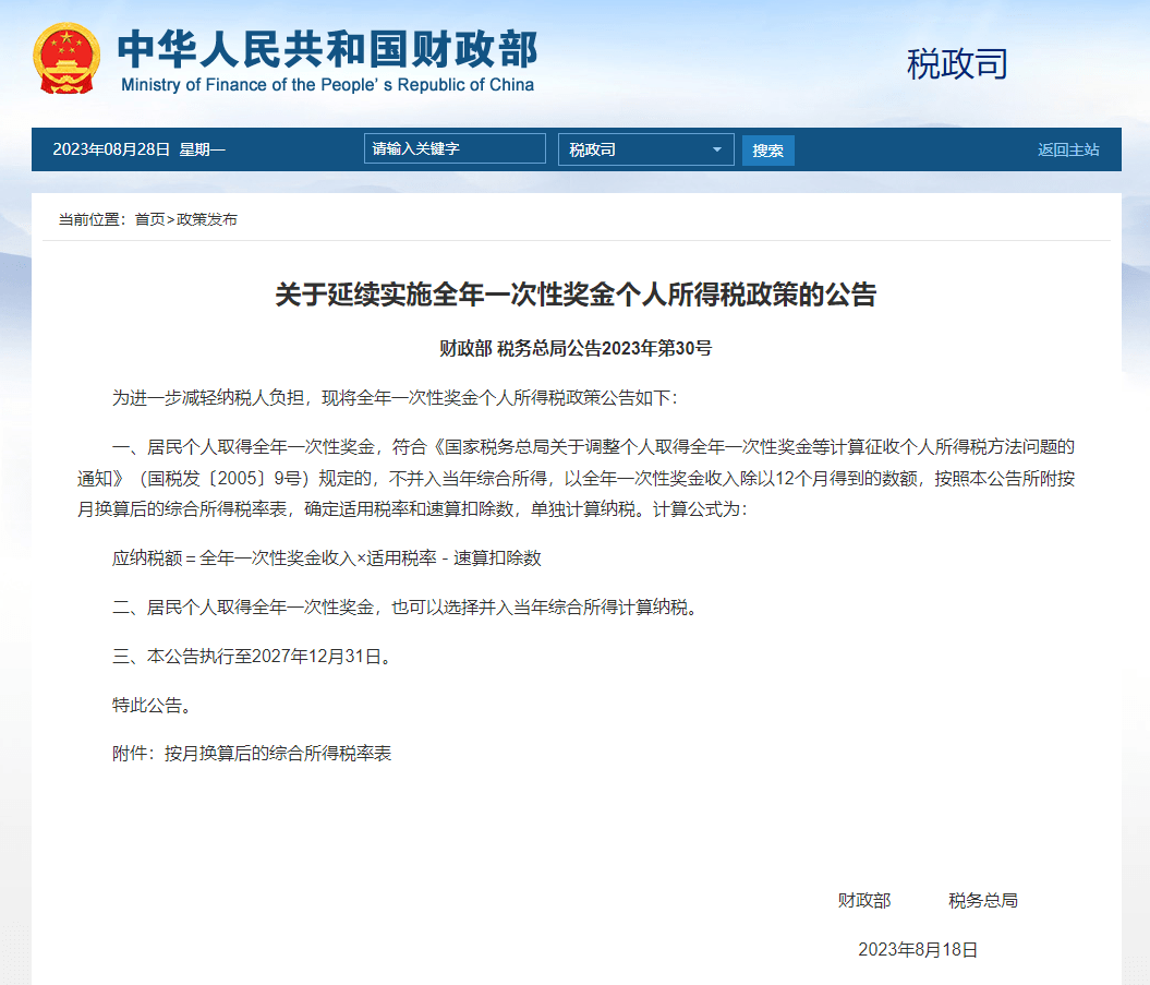 全年一次性獎金個人所得稅政策延續(xù)實施至2027年12月31日