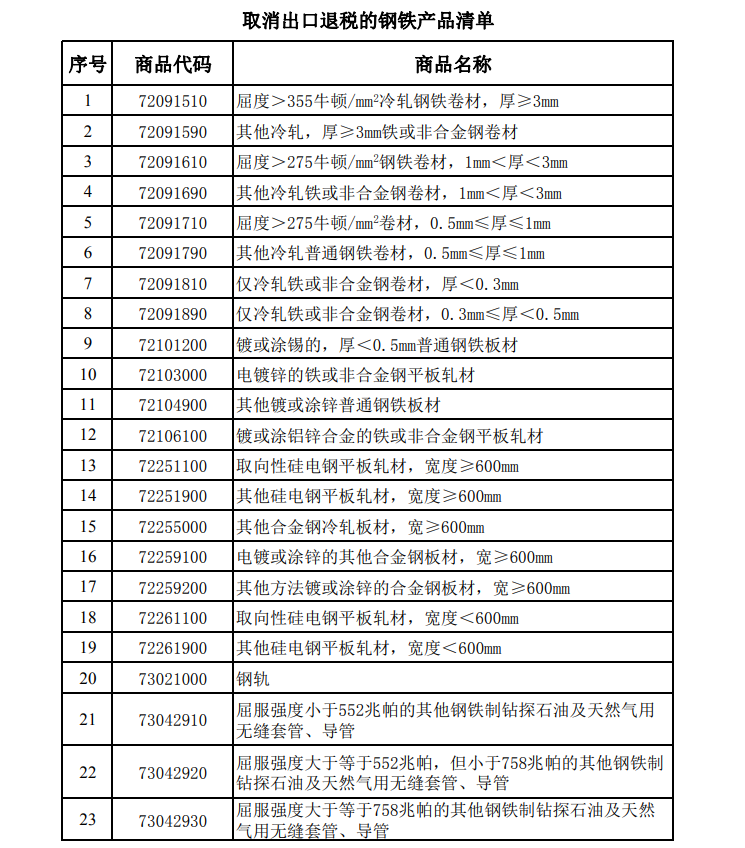 And from August 1, 2021, the export tax rebate for the 23 steel products listed in the figure below will be cancelled. The specific execution time shall be defined by the export date indicated on the export goods declaration form.