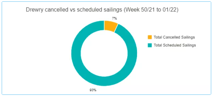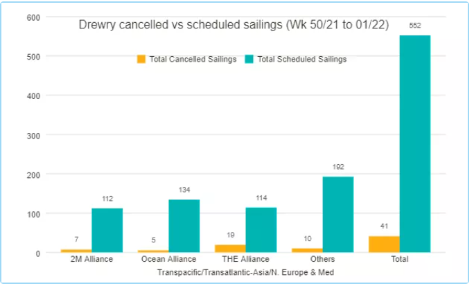? ? ? ? According to THE latest data released by Drury on December 10th, in THE next 4 weeks (50-1 week), THE three major shipping alliances in THE world cancelled multiple voyages successively, among which THE alliance cancelled 19 voyages THE most. 2M alliance reached 7 voyages; The fewest sea Alliance cancels 5 sailings.
